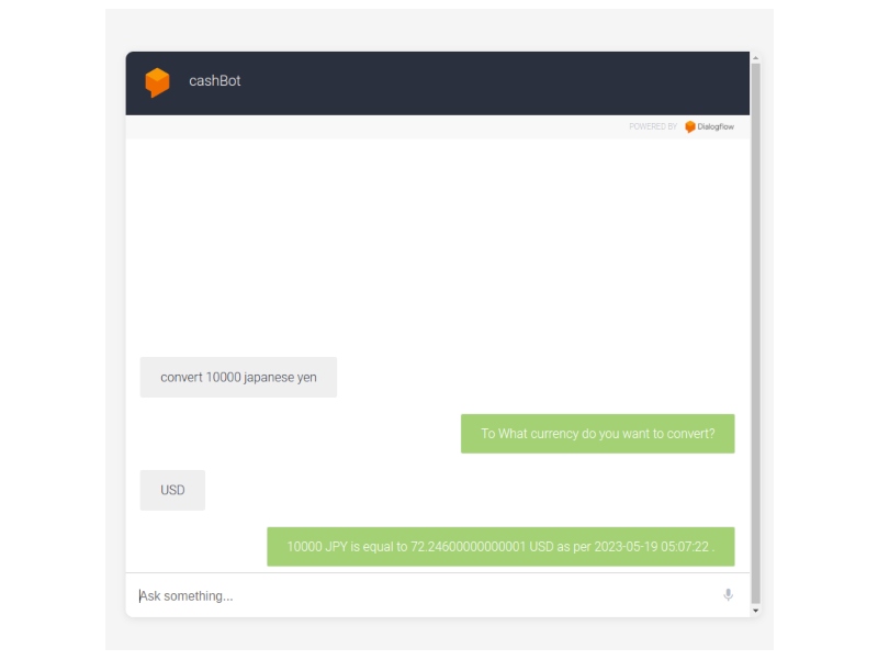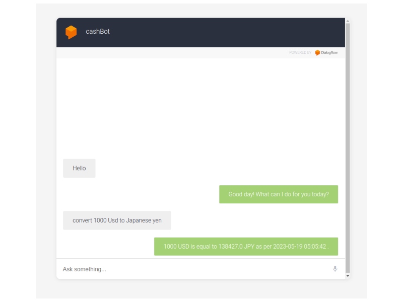 CashBot is a Flask-based web application integrated with Google Dialogflow, designed to provide a conversational interface for currency conversion.
